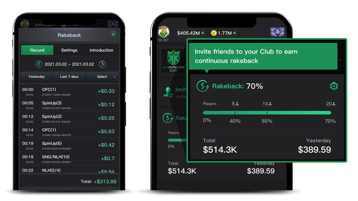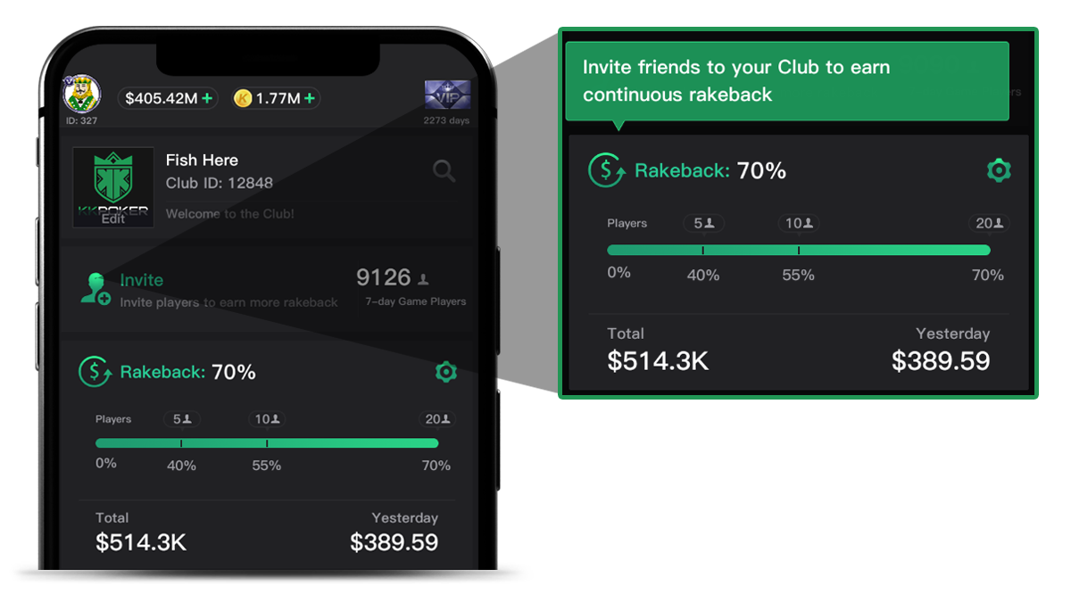 You are eligible to earn 40% rakeback when your club has just 5 active members and earn up to 70% from just 20 active members. After that, make sure to use all the KKPoker resources and support teams to grow your club even further!